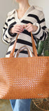 This must have bag is made from high quality woven vegan leather and includes a vegan leather shoulder strap, a canvas striped hand strap, and a snap closure.
