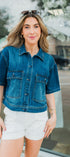 The Iverson Denim Top in our medium wash is a short-sleeve cropped shirt designed with oversized pocket details.