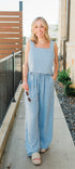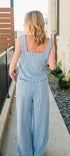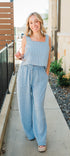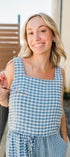 Light blue gingham square neck top featuring a flowy wide leg matching pant.