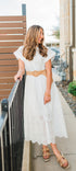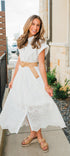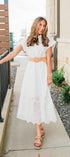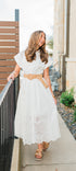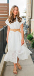 The Hamptons Dress in Off White features a charming eyelet embroidered scallop hem, short cuff sleeves, and a button-front closure. Complete with a detachable woven belt, side pockets, and a lightweight lined design.