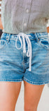 The Ardyn Shorts in a medium true blue wash features a comfortable front tie detail and a relaxed fit, crafted from soft, breathable fabric for all-day wear.