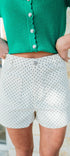 The Emery Shorts in cream and black feature a chic polka dot design with a high waist, zip-fly button closure, and functional front and back pockets. Crafted from lightweight, non-sheer woven fabric, these unlined shorts combine style and comfort effortlessly.