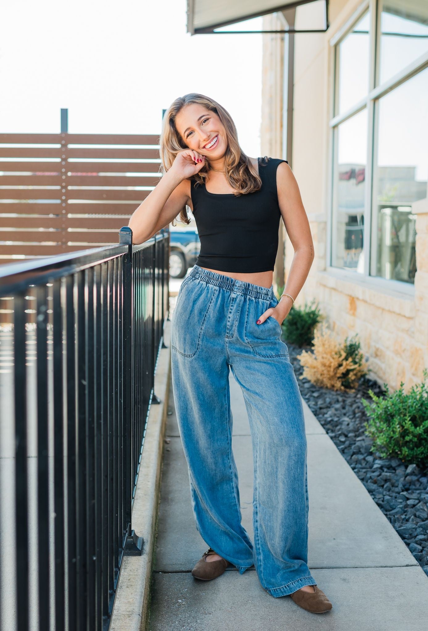 The Carson Knit Top in black offers a sleek and versatile sleeveless design, perfect for layering or wearing solo.