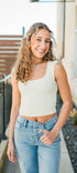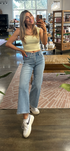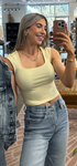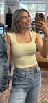 The Carson Knit Top in butter yellow offers a sleek and versatile sleeveless design, perfect for layering or wearing solo.