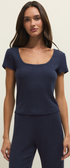 The Flower Market Rib Tee in Eclipse combines comfort and style with its lightweight, silky ribbed fabric. Made from a blend of 97% polyester and 3% spandex, this short-sleeve tee features a flattering scoop neckline and a regular fit. It's buttery soft. Great for traveling. Pair with any of our cute denim or wear to lounge around!