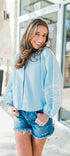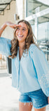 The Poppy Top in baby blue features 3/4 puff sleeves and bold embroidery for a statement look. A split neckline with contrast trim along the placket and collar adds a touch of refined detail.