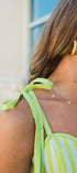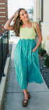 The Aruba Dress in Kiwi Green features a vibrant color block design with a flattering silhouette and breathable fabric, perfect for warm, sunny days. This adorable midi dress effortlessly blends style and comfort.
