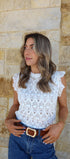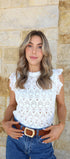 The Del Mar Top in white features a wing sleeve knitted sweater design with an open knit texture, a round neckline, and delicate lace trim details at the shoulders. This top can easily be paired with denim, a skirt or cute shorts!